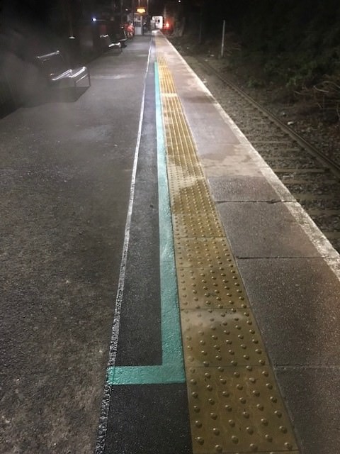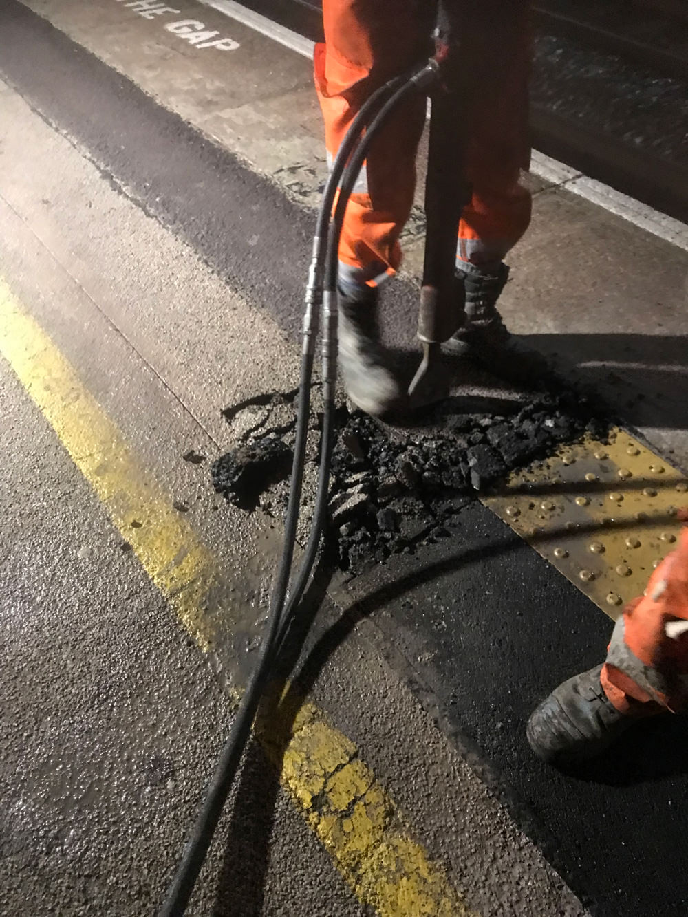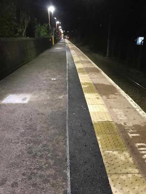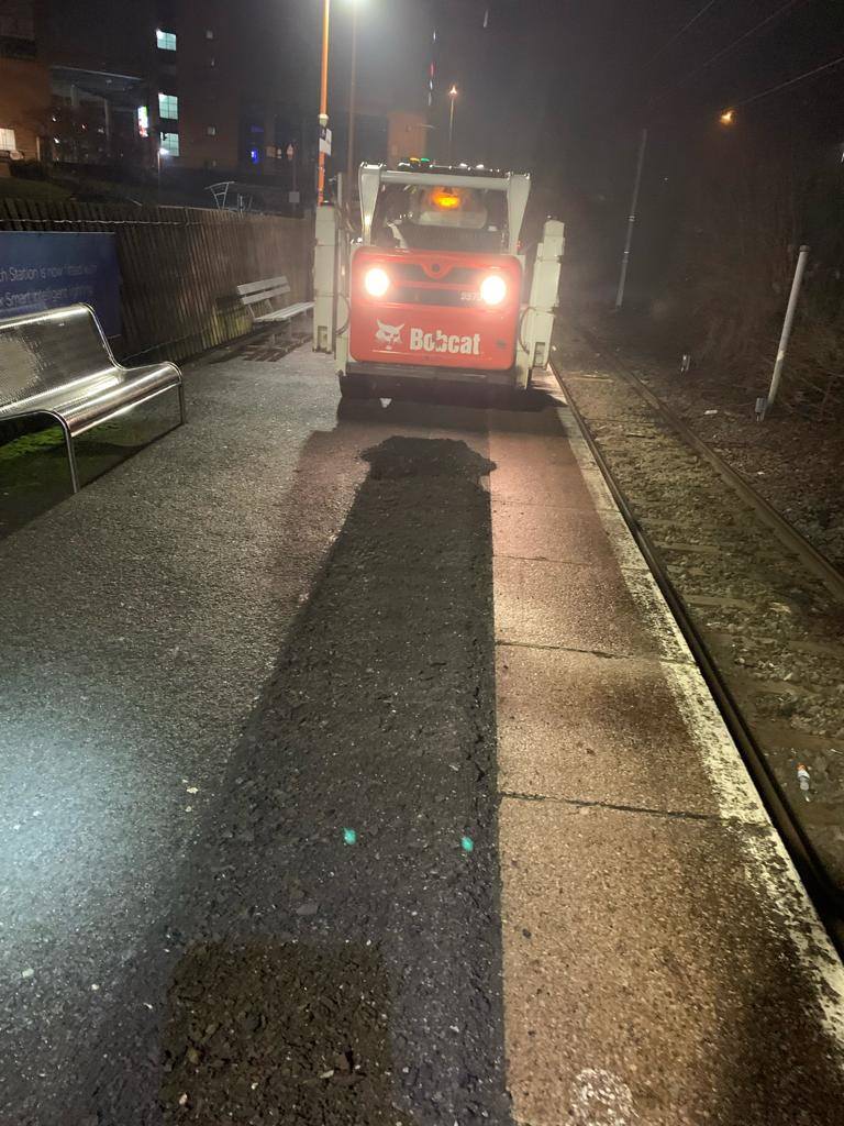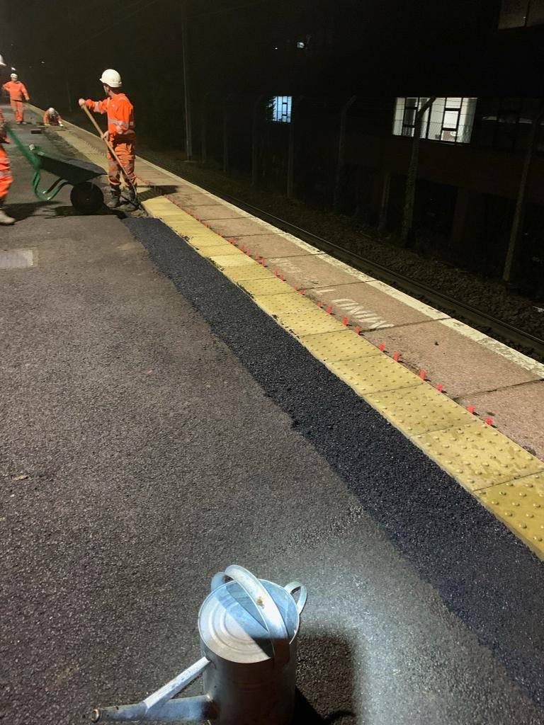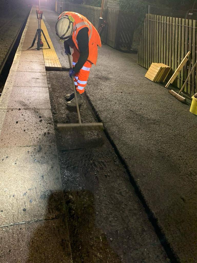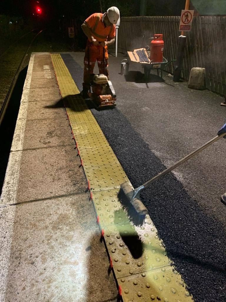 Serfis Construction and engineering attended site with our PTS qualified inhouse surfacing and civils teams during midweek and weekend planned possessions to plane off the required areas for installation of the tactile paving and supporting 400mm tarmac strip behind to ensure no issues with varied levels which were left because of the new installation. Our team assisted with the preparation and installation of the new tactile paving before installing renewing the area of platform surface required.